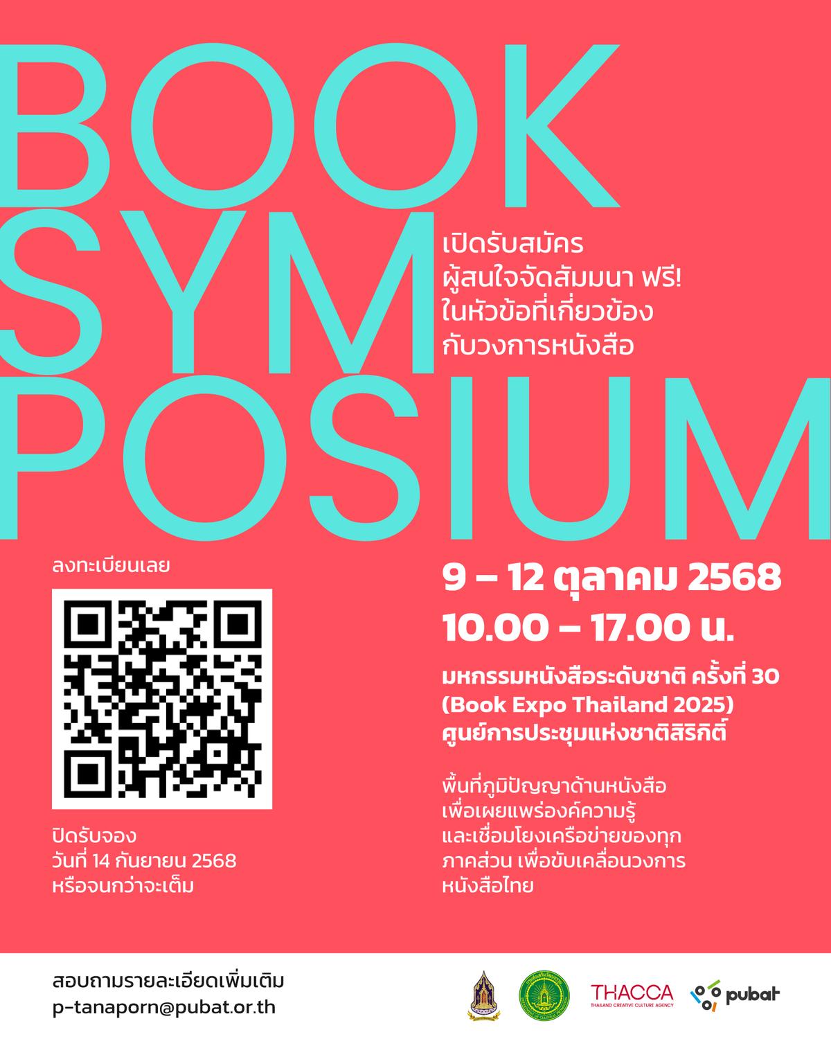 Book Symposium จะจัดขึ้นระหว่างวันที่ 9 – 12 ตุลาคม 2568 เวลา 10.00 – 17.00 น. ณ ห้อง MR 206 ชั้น 2 ศูนย์การประชุมแห่งชาติสิริกิติ์ ภายในงานมหกรรมหนังสือระดับชาติ ครั้งที่ 30