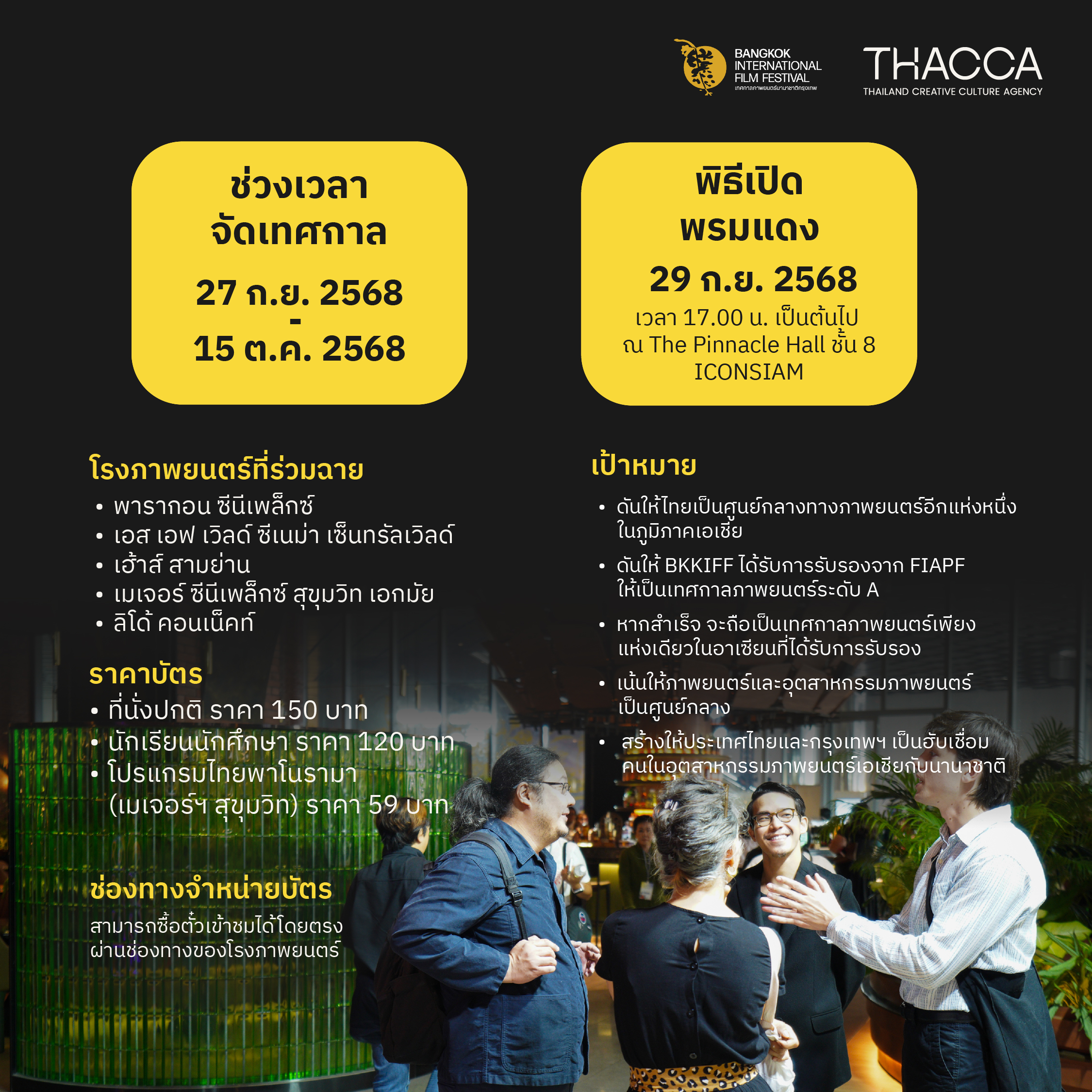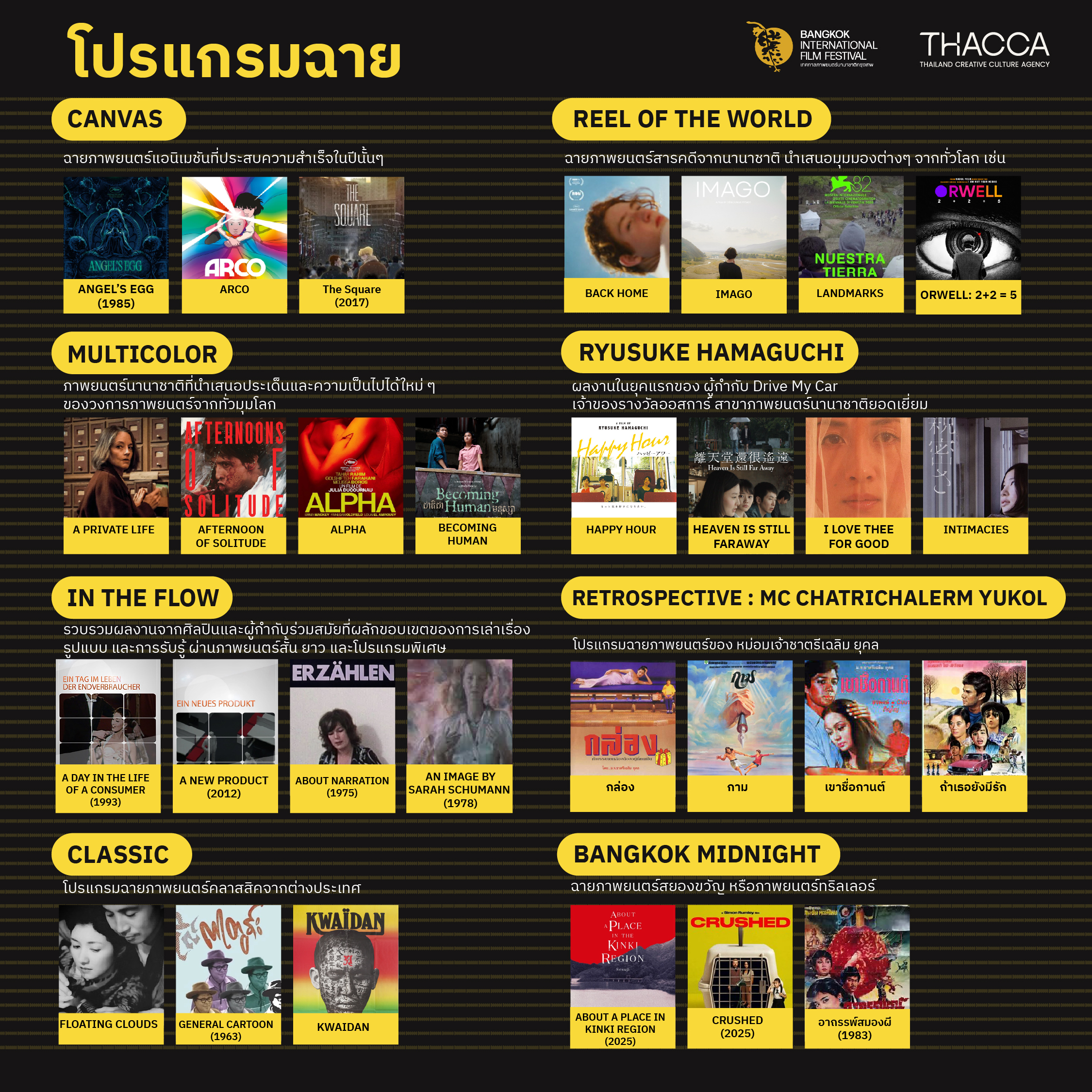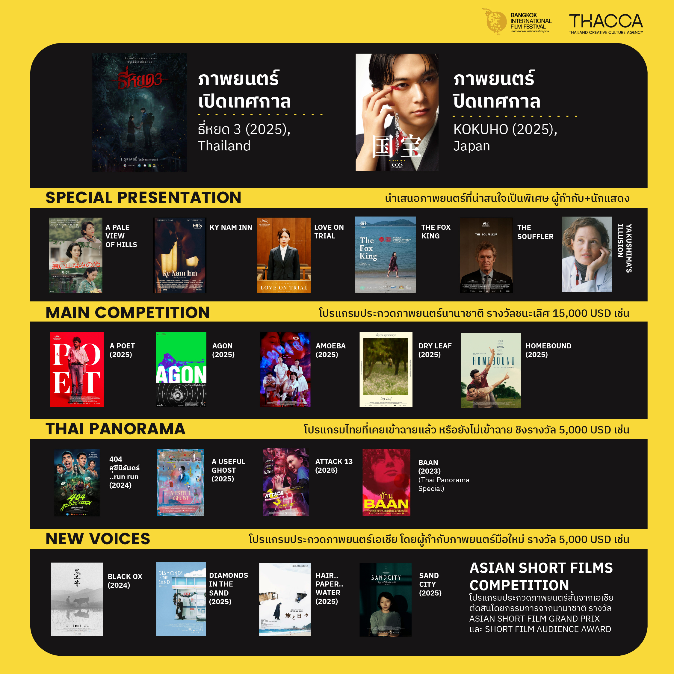 เทศกาลปีนี้เปิดฉากด้วยภาพยนตร์ “ธี่หยด 3” (2025) จากประเทศไทย และปิดเทศกาลด้วย “KOKUHO” (2025) จากญี่ปุ่น พร้อมด้วย SPECIAL PRESENTATION ที่นำภาพยนตร์คุณภาพและทีมผู้สร้างมาพบแฟนหนังชาวไทย เช่น A PALE VIEW OF HILLS, KY NAM INN, LOVE ON TRIAL, THE FOX KING, THE SOUFFLER และ YAKUSHIMA’S ILLUSION
